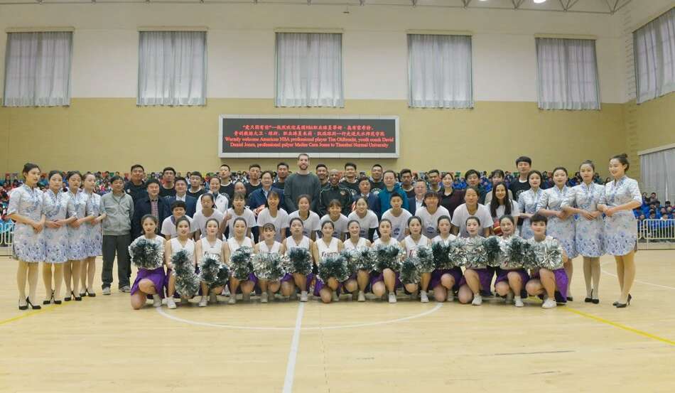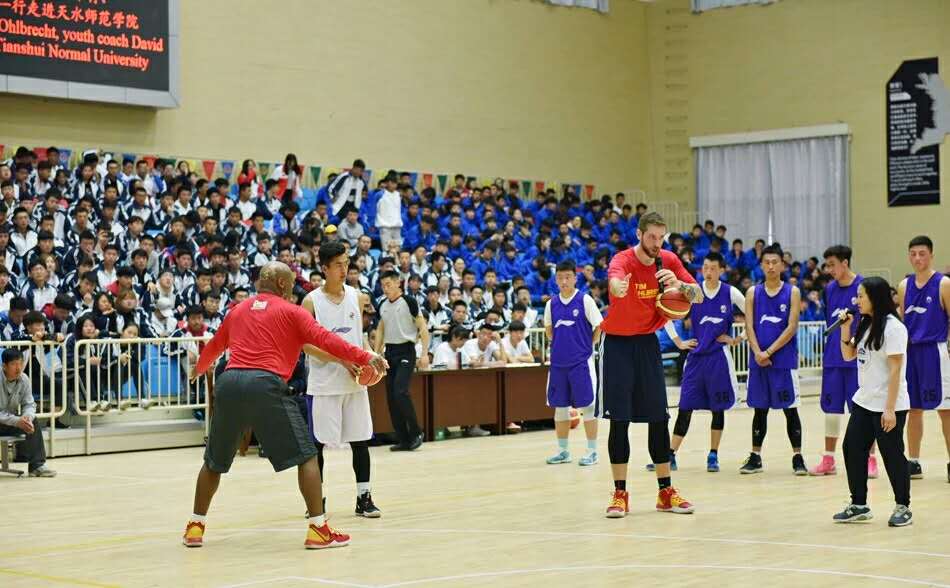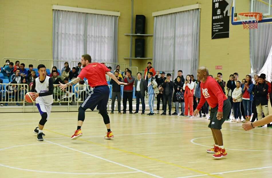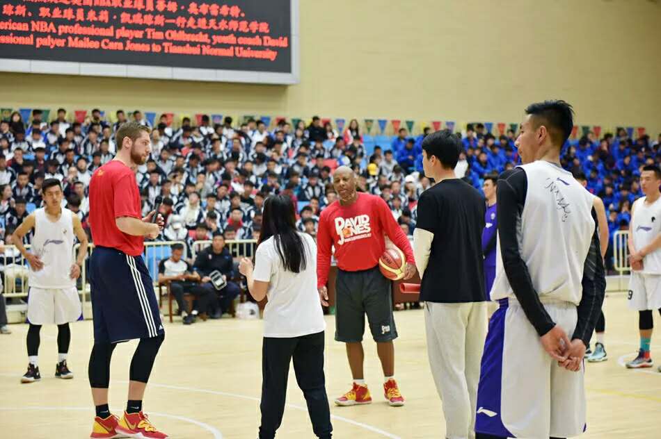 随后,在啦啦操的表演中拉开了今天篮球教学比赛观摩及演练交流活动的序幕,在蒂姆·奥布雷希特、大卫·琼斯的现场观看、指导下,pg娱乐电子游戏官网入口女子篮球队、男子篮球队进行了表演比赛,比赛异常激烈。紧接着迎来了比赛的高潮部分,美国嘉宾蒂姆·奥布雷希特、大卫·琼斯分别加入到学生的两支男子球队中,与我校男子篮球队队员同框为现场的观众带来了一次精彩的NBA视觉盛宴,尤其是球员蒂姆·奥布雷希特的扣篮动作赢来了一次又一次的欢呼声。精彩的比赛过后,邀请三位美方嘉宾给球员们教练进行技术辅导,现场指导篮球队员投篮动作,临场教学,再一次拉近了与球员们的距离,增进了友谊,队员们认真聆听嘉宾们的指导,脸上洋溢着溢于言表的愉悦。三位美方嘉宾为篮球队员进行防守及进攻动作指导,最后优秀队员与球星二对二实战交流演练。