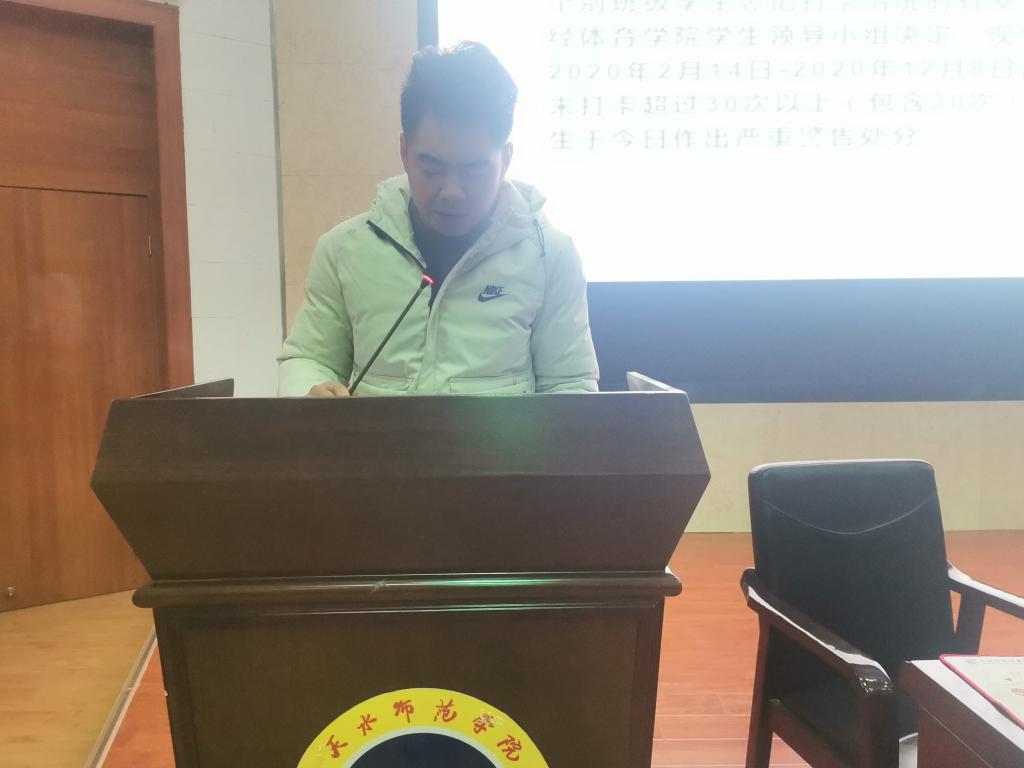 12月21日晚,体育学院在二号报告厅召开考试诚信教育大会暨学生干部聘任大会,学院党政领导班子,各教学系(部)主任,辅导员,19级、20级各班班主任,20级全体学生,以及19级、18级、17级各班学生代表共计370多人参加。大会由学院团委书记王昊支持。