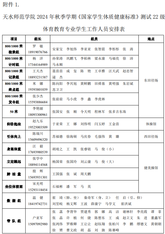 附件1.pg娱乐电子游戏官网入口2024年秋季学期《国家学生体质健康标准》测试22级体育教育专业学生工作人员安排表