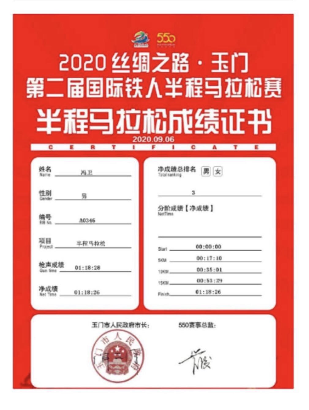 由甘肃省体育局、玉门市人民政府主办,玉门市文体广电和旅游局、玉门市体育中心、玉门市委直属机关工委承办,戈友文化传媒(上海)有限公司运营的2020丝绸之路.玉门第二届国际铁人半程马拉松赛于9月6日在玉门市政广场鸣枪开赛,有来自全国19个省份,60多个城市,共计5000名专业马拉松选手参加本次比赛,pg娱乐运动训练专业2018级冯卫同学,在比赛中不畏强手,最终以1小时18分26秒获得男子组第三名的好成绩,为我校争得了荣誉!