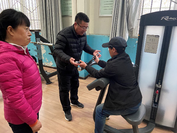 在残疾人体育运动与康复实践授课中:魏玉琴老师携7名学生围绕创编的《残疾人拉力带健身操舞》和《残疾人全身健身操舞》展开教学,重点通过借助拉力带的辅助作用,使残疾人的肩部、颈部、腰部起到良好的运动康复训练;而全身健身操舞则由下肢的34步组成,这对残疾人的全身活动起到了重要作用。陈玮老师选用自主创编的《轮椅健身操舞》,隶属徒手类健身项目,使残疾人在音乐伴奏下,融入多种时尚舞蹈元素为一体的有氧运动,重点对残疾人头、颈、肩、胸及腰等5部位的运动康复练习起到促进作用。段文义教授则通过pg娱乐健身房内残疾人体育运动与康复训练的专业性器械设备,进行悉心的指导和动作演示,这对满足残疾人业余时间内的体育健身、机能恢复、伤残康复训练提供指导与帮助。